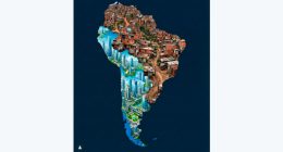 Na imagem, países porquê Brasil, Colômbia, Uruguai e Venezuela são representados porquê uma grande favela, enquanto Argentina, Chile e Paraguai são ilustrados porquê centros urbanos modernos.